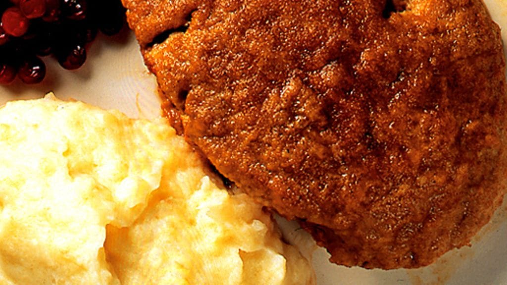 3. Muotoile isoja pyöreitä pihvejä, korkeintaan sentin paksuisia ja kääntele ne hienoissa korppujauhoissa. Paista pihvit voissa, nosta lautasille tai tarjoiluvadille ja kaada ruskistettua voita päälle. Tarjoile aitojen, oheisten lisäkkeiden kanssa.
