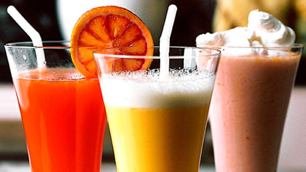 3. Rosa drinkki: Sekoita maito, hieman jäämurskaa, puristettu appelsiinimehu ja sokeriripaus sähkövatkaimella, kaada lasiin ja kruunaa kermavaahtonokareella.