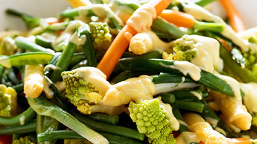 3. Lado vihannekset suureen tarjoilukulhoon, tarjoile kastikkeen kera.