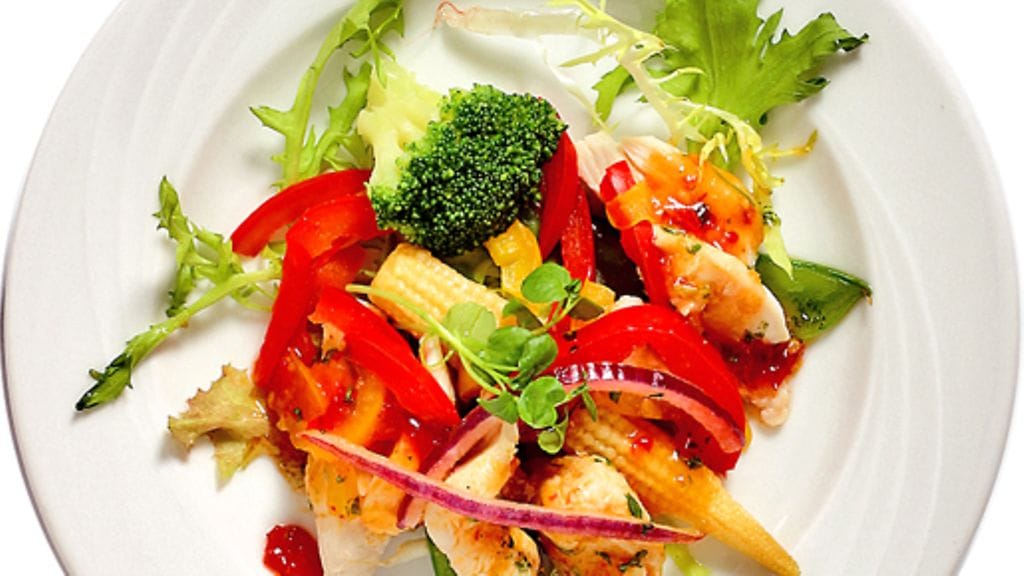 3. Suikaloi paprika, leikkaa parsakaali pieniksi kimpuiksi, kuori ja viipaloi sipuli. Keitä minimaissi, paprika, sokeriherneet ja parsakaali nopeasti kevyesti suolatussa vedessä. Asettele vihannekset lautasille, päälle punasipulia ja päällimmäiseksi kanaa. Kaada päälle chilikastiketta.