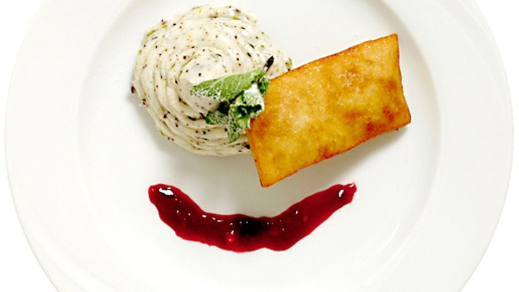 3. Ota jäädyketuutit pakastimesta 15 minuuttia ennen tarjoilua. Poista piirtoheitinkalvot ja asettele jäädyketuutit jälkiruokalautasille. Koristele vohvelikekseillä ja vadelmakastikkeella.