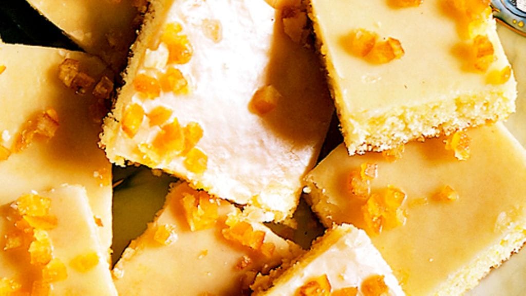 3. Laita leivinpaperi ja pelti valmiin kakun päälle ja anna sen jäähtyä. Sekoita kuorrutus, levitä se kakulle ja ripottele päälle hillottua appelsiininkuorta. Paloittele ruuduiksi.