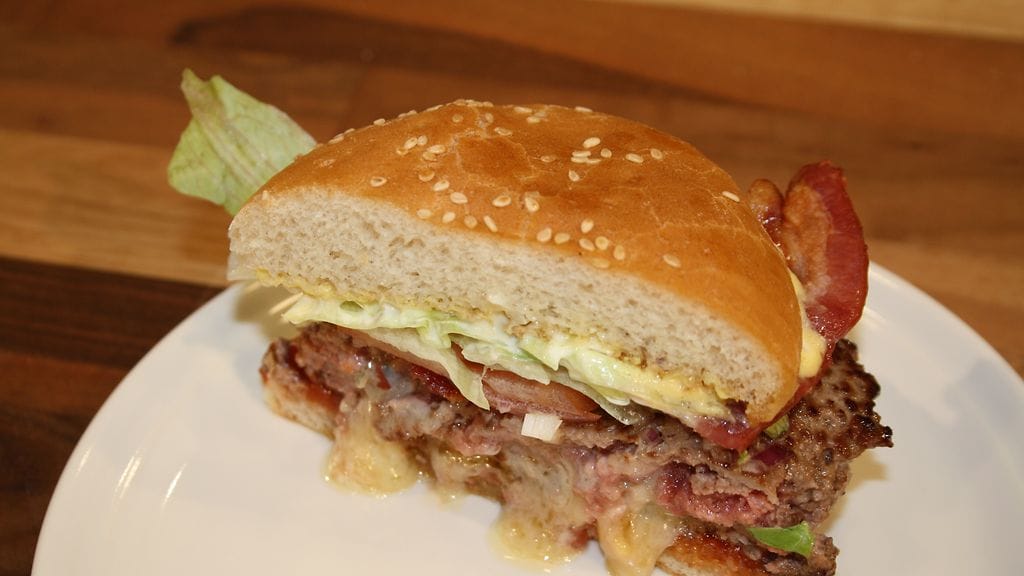 Sekoita suuressa kulhossa jauheliha, hienonnettu punasipuli ja pippuri. Sekoita käsin ainesosat sekaisin. Tee 48 ohutta pihviä ja tee pihvin keskelle pieni kuoppa, johon lisäät sinihomejuustopalan. Sen jälkeen aseta toinen pihvi ensimmäisen päälle ja painele reunat yhteen. Katso, että juusto peittyy kokonaan. Lisää suolaa ja pippuria molemmille puolille.