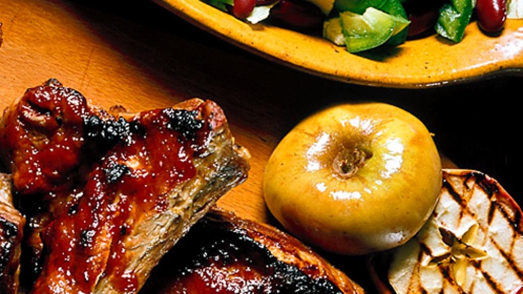 5. Tarjoile grillattujen omenanpuolikkaiden kanssa. Sekoita myös salaatti punaisista pavuista, vihreästä paprikasta, salaattikiinankaalista ja tomaateista. Viimeistele vinaigrettella.