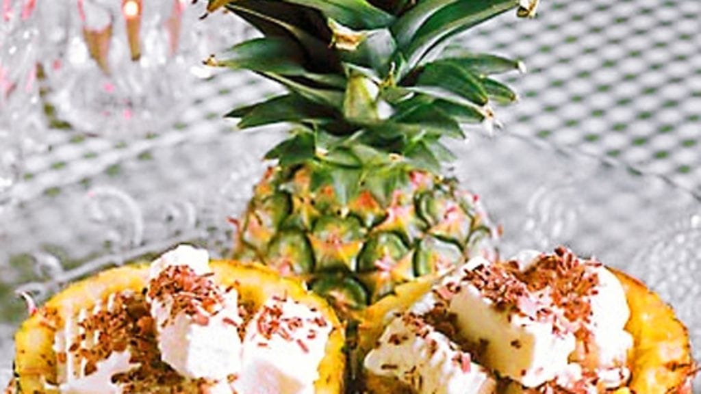 Tämä on täydellinen jälkiruoka, kun haluat jotakin oikein maukasta ja helppoa. Koverra ananas, täytä se jäätelöllä ja suklaalla, ja voilà, valmista!