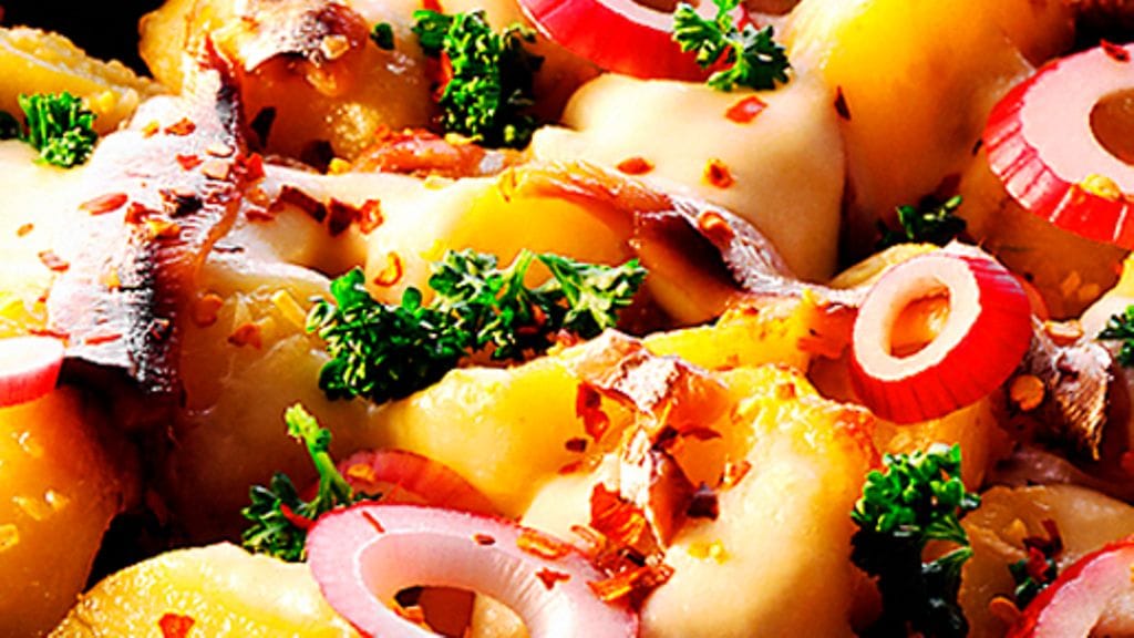 3. Paista perunat voinokareessa. Lisää anjovisfileet ja punasipuli, anna kaiken lämmetä. Norota päälle kastiketta, koristele persiljalla. Muutama hyppysellinen chilihiutaleita antaa lisäterävyyttä.