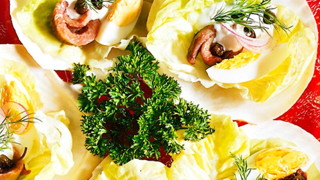 2. Asettele jokaiselle lautaselle salaatinlehti ”simpukaksi”. Kääri anjovisfileet rullalle ja laita kaksi rullaa jokaiselle salaatinlehdelle.