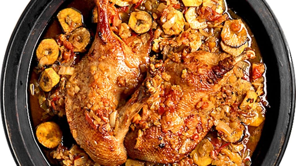 3. Paista ankkaa uunissa 40 minuuttia. Kuori ja viipaloi banaanit. Valele ankkaa tomaattikastikkeella ja laita banaanit sen vierelle vuokaan. Paista vielä 20-30 minuuttia, kunnes ankan lihaneste on väritöntä ja kirkasta, kun sitä pistää paksuimpaan kohtaan. Tarjoile ruoka keitetyn riisin tai perunoiden kanssa.