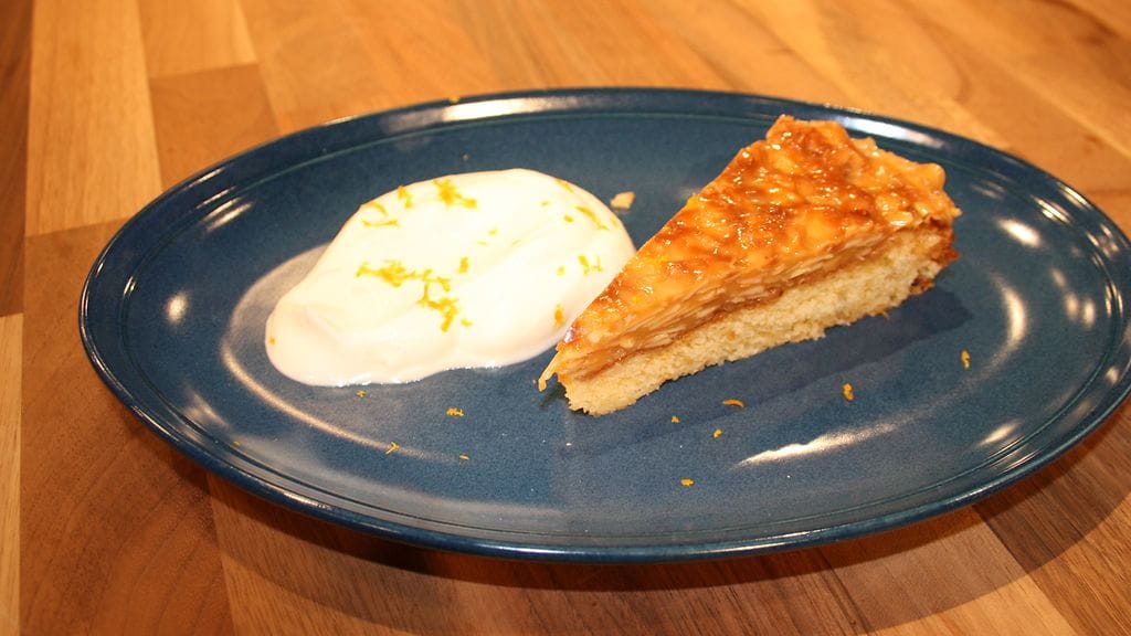 Levitä kuorrutus paistetun kakkupohjan päälle. Kuorruta 225-asteisessa uunissa noin 5 minuuttia kunnes pinta on kauniin ruskea. Anna kakun jäähtyä hetki ennen vuoasta irrottamista ja leikkaamista. Tarjoile kermavaahdon tai vaniljajäätelön kanssa.