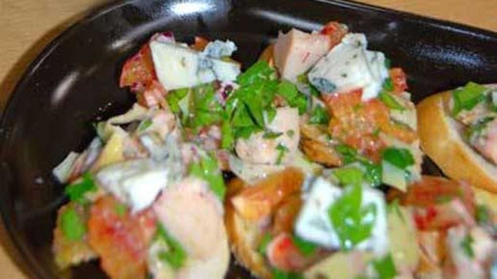 Leikkaa leivästä 8 suupalan kokoista palaa ja paahda niitä hetken uunissa juuri ennen tarjoilua, niin että ne ovat rapeita. Lusikoi jokaisen leivän päälle ruokalusikallisen verran appelsiinisalaattia, asettele päälle artisokan puolikas sekä murunen roquefortia. Rouhaise jokaisen päälle pieni mustapippuriripaus ja tarjoile heti.
