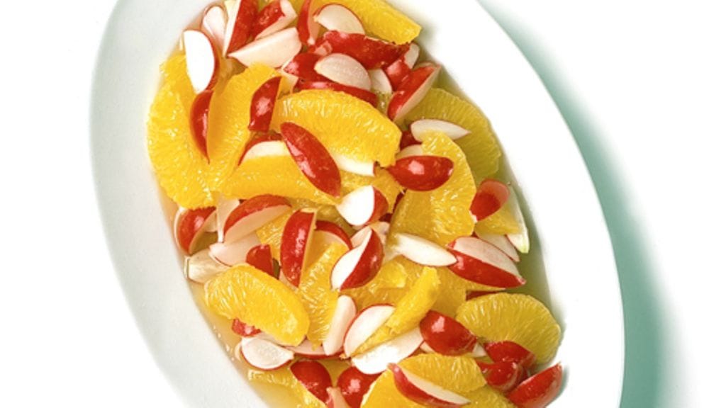 1. Kuori appelsiini terävällä veitsellä niin että saat mukaan myös kuoren valkoiset osat. Leikkaa appelsiinista kalvottomia lohkoja ja asettele ne tarjoiluvadille. Puhdista retiisit ja paloittele, sekoita appelsiinien kanssa.