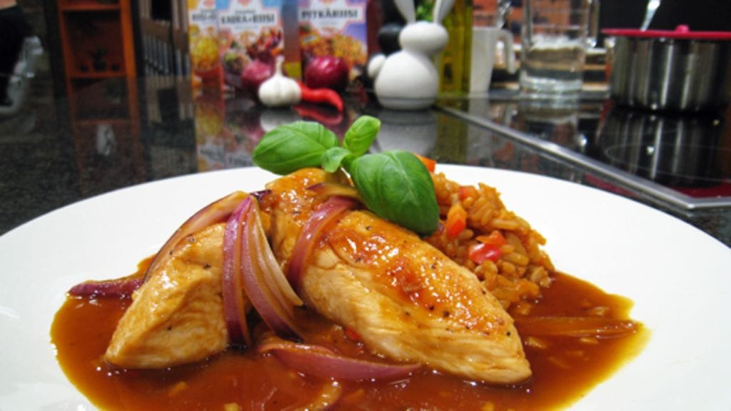 Suikaloi broilerin rintafileet pitkittäin. Ruskista fileet kevyesti öljyssä. Sekoita joukkoon sipuli, valkosipuli sekä chili ja kuullota hetki.