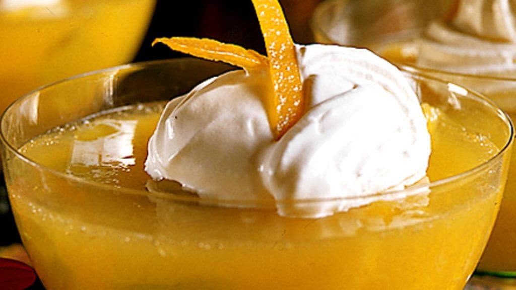 3. Sekoita appelsiinimehu ja sitruunamehu, lisää halutessasi hieman sokeria. Lisää liivate ja sekoita. Jaa hedelmät kulhoihin, kaada liemi päälle ja anna jähmettyä jääkaapissa.