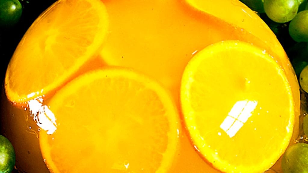 2. Asettele appelsiininviipaleet vedellä huuhdellun pyöreäpohjaisen kulhon pohjalle. Kaada päälle sen verran appelsiinimehua, että viipaleet peittyvät. Laita astia jääkaappiin siksi aikaa, että mehu on hyytynyt. Kaada päälle loput mehusta ja laita takaisin hyytymään jääkaappiin.