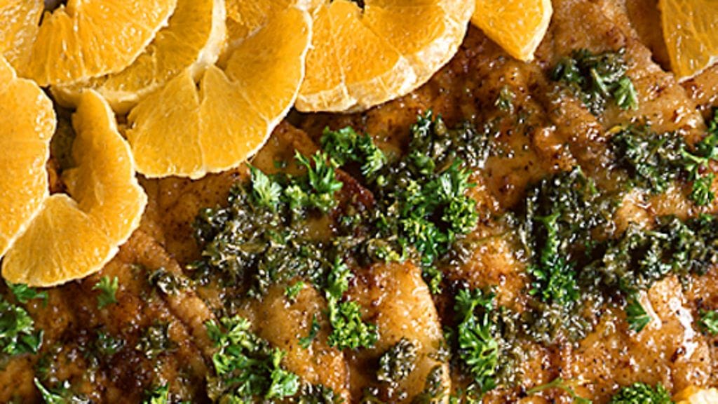 3. Paista kalafileet voissa pari minuuttia molemmin puolin, laita vadille. Kaada appelsiinimehu lämpimien kalojen päälle. Koristele persiljalla ja appelsiiniviipaleilla.