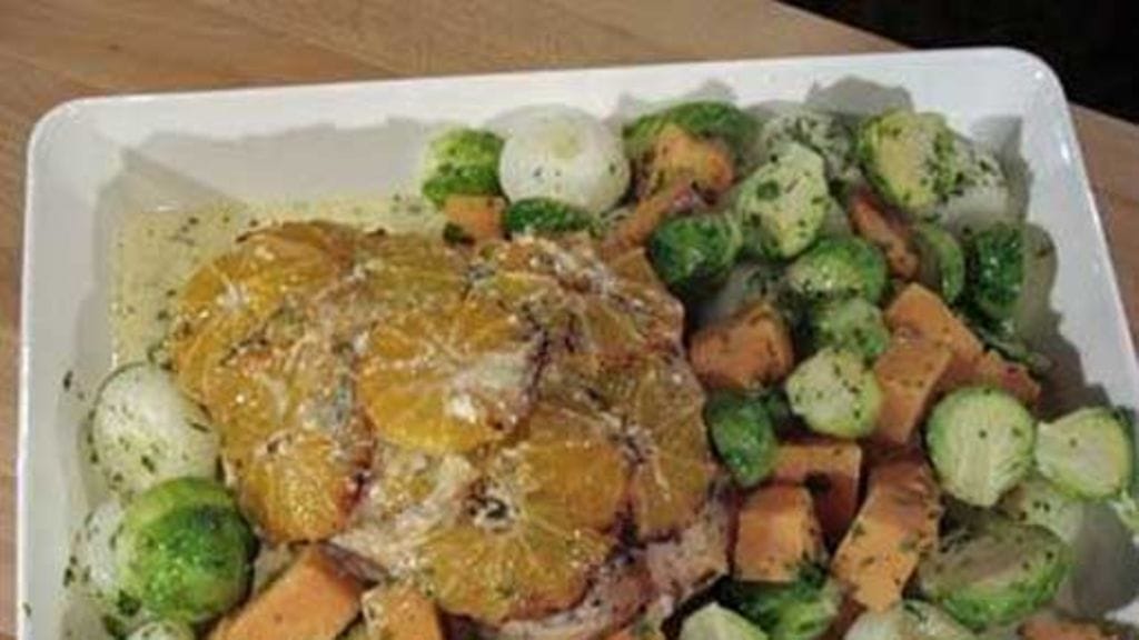 Laita kalkkuna voideltuun uunivuokaan. Penslaa se hunajalla. Mausta rinta suolalla, pippurilla ja hienonnetulla salvialla. Leikkaa appelsiinista kuori pois. Siivuta se noin 1 cm kiekoiksi ja asettele kiekot kalkkunan rinnan päälle. Kaada vuokaan kanaliemi ja kerma. Aseta rintaan sisälämpömittari ja laita rinta uuniin 200 asteeseen, noin 15 minuutiksi. Laske lämpöä 150 asteeseen ja kypsennä rintaa kunnes sisälämpötila on 68 astetta. Anna rinnan levähtää hetki ennen tarjoilua. Siivuta kalkkuna ohuesti ja tarjoile appelsiinin ja bataatin kera.