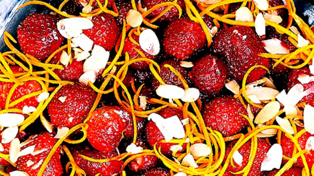3. Ryöppää appelsiininkuori nopeasti ja ripottele kuorta sekä manteleita mansikoille. Sihtaa päälle tomusokeria.