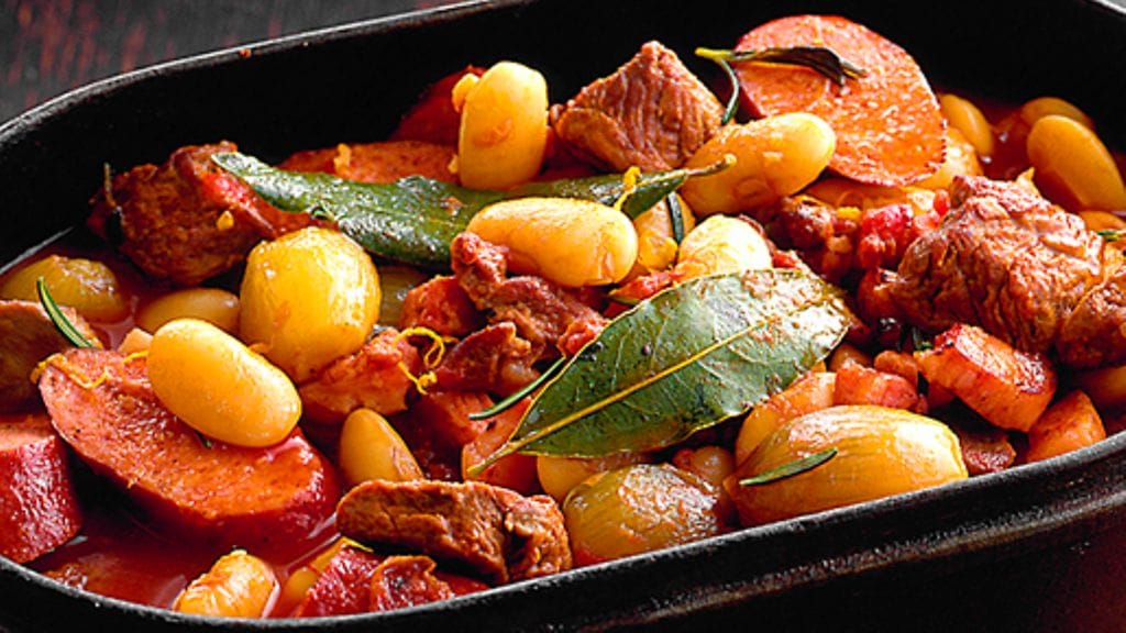 1b. Leikkaa liha kuutioiksi. Poista siansivusiivuista kamara ja leikkaa läskiviipaleet suikaleiksi. Ruskista lihakuutiot erissä ja lopuksi läskisuikaleet. Siirrä lihat pataan. Samoin liotetut pavut. Mausta suolalla, pippurilla ja rosmariinilla. Purista sekaan valkosipulinkynnet ja lisää myös laakerinlehdet. Kaada joukkoon lihaliemi, viini ja sekoita mukaan tomaattipyree. Kuumenna kiehuvaksi ja anna poreilla hiljaa 45 minuuttia.