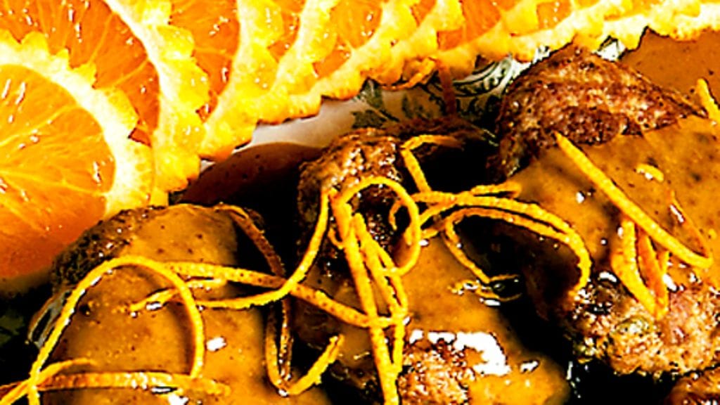3. Ryöppää appelsiinikuorisuikaleet nopeasti vedessä. Kaada kastike pihveille ja koristele suikaleilla.