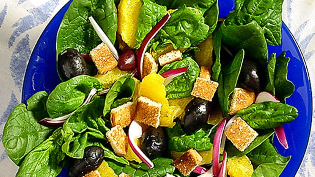 2. Huuhdo pinaatinlehdet huolellisesti ja taputtele ne kuiviksi pyyhkeiden välissä. Kuori ja suikaloi sipuli ohuesti. Lado pinaattia, appelsiinilohkoja, oliiveja ja sipulia vadille tai kulhoon. Paahda leipäviipaleet. Hiero niihin valkosipulia, jonka olet halkaissut, ja ripottele päälle hieman suolaa. Kuutioi viipaleet ja ripottele salaatin päälle.