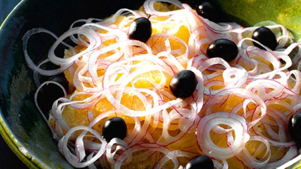2. Kuori punasipuli ja viipaloi se ohuesti, suolaa viipaleet ja laita sivuun. Sekoita appelsiinimehu, oliiviöljy, suola, pippuri ja minttu. Kaada kastike appelsiineille.