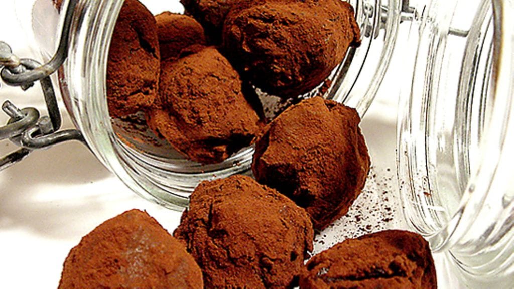 3. Laita päälle kertakäyttökäsineet ja pyörittele tryffelimassasta palloja. Kierittele tryffelit kaakaojauheessa. Anna niiden jähmettyä kokonaan jääkaapissa.