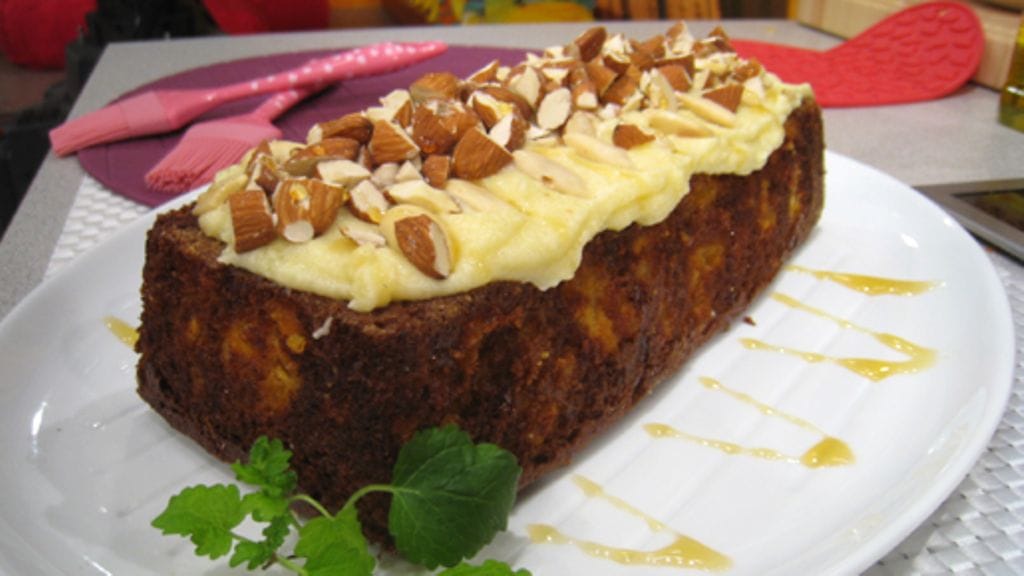 Vaahdota oliiviöljy ja sokeri keskenään. Vatkaa kananmunat kevyeksi vaahdoksi ja lisää sokeri-öljyvaahtoon koko ajan vatkaten. Hienonna mantelit ja aprikoosit teholeikkurissa tai monitoimikoneessa karkeaksi. Lisää taikinaan yhdessä hillon kanssa.