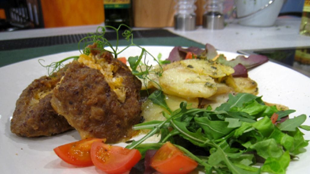 Täytettä varten soseuta aprikoosit ja vuohenjuusto keskenään esimerkiksi tehosekoittimessa. Muotoile kostutetuin sormin jauhelihamassasta kahdeksan suorakaiteen muotoista levyä. Lusikoi täytettä jokaisen levyn keskelle ja muotoile käsin kääryleiksi.
