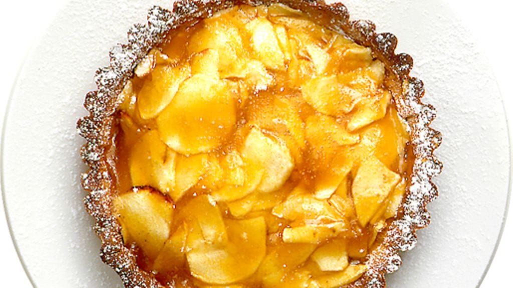 2. Kauli taikina ohueksi levyksi ja vuoraa sillä iso irtopohjavuoka. Kuori omenat ja poista siemenkodat. Leikkaa omenat noin 3 millimetrin viipaleiksi. Asettele omenaviipaleet piiraspohjan päälle ripottele pinnalle sokeria. Paista 25-30 minuuttia, kunnes pohja on kauniin värinen ja omenat pehmeitä.