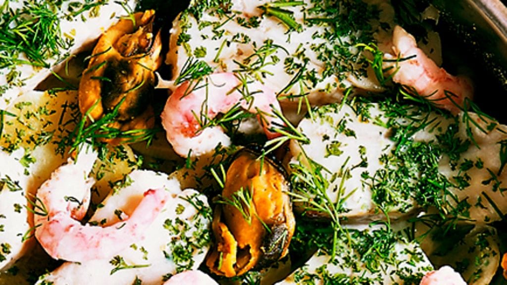 3. Lisää valmiiseen pataan valutetut simpukat, katkaravut ja tillisilppu ja kuumenna nopeasti, älä keitä.