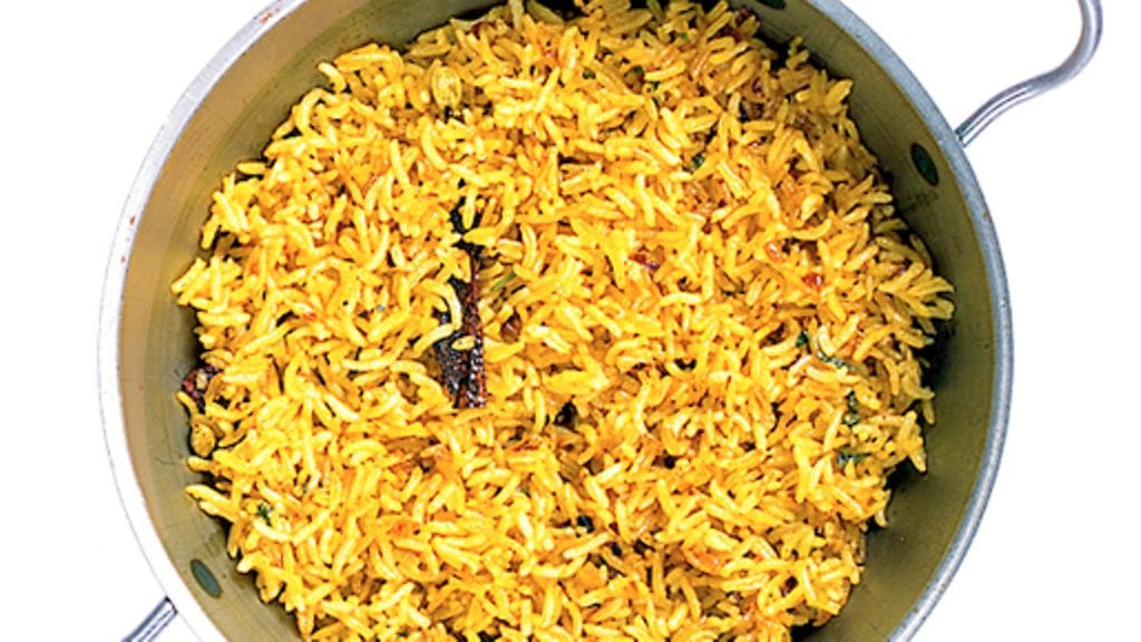 3. Lisää riisi ja kurkuma ja sekoita. Lisää vesi, suola, neilikat ja laakerinlehti. Sekoita, kiehauta ja alenna sitten lämpöä mahdollisimman pienelle. Anna riisin hautua hitaasti kannen alla noin 20 minuuttia, kunnes se on pehmeää ja vesi on imeytynyt täysin. siirrä kattila levyltä ja anna riisin seistä vielä 5 minuuttia kannen alla.