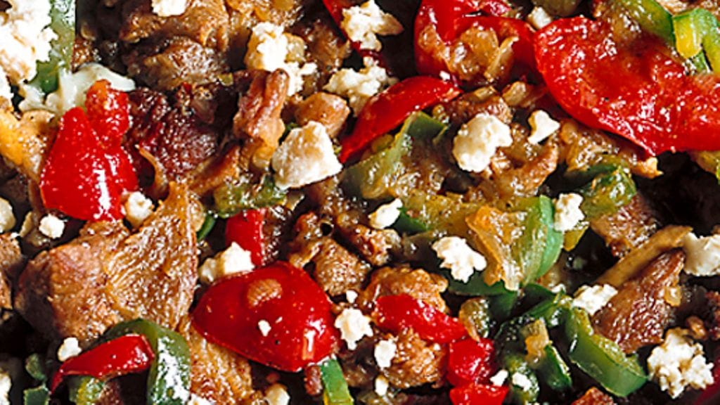 2.Lisää paprikasuikaleet, kypsennä. Murustele homejuusto padan joukkoon vasta juuri ennen tarjoilua. Lisäkkeeksi riisiä.