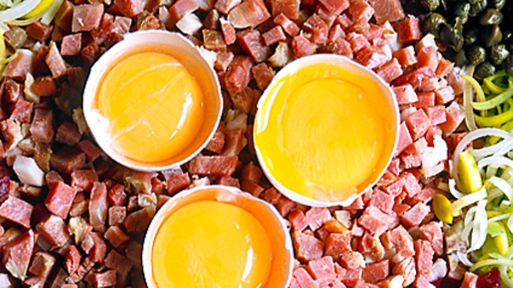 Kuutioi keittokinkku ja säilykepunajuuret, suikaloi purjo. Asettele vadille kapristen ja keltuaisten kera (kuorissaan). Älä unohda asettaa tarjolle mustapippuria!