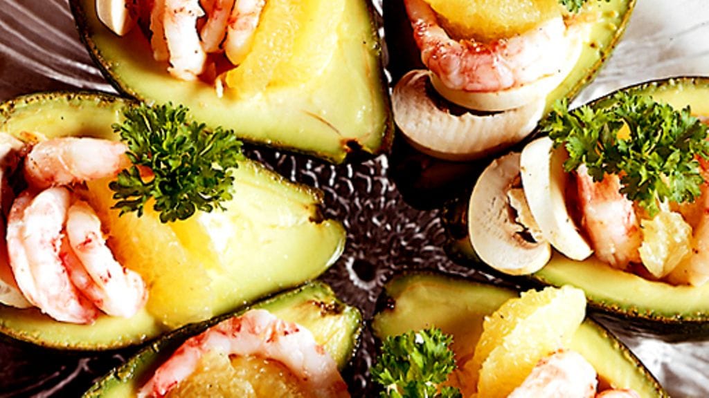 2. Täytä avokadot ohuesti viipaloiduilla herkkusienillä, katkaravuilla sekä greipillä.