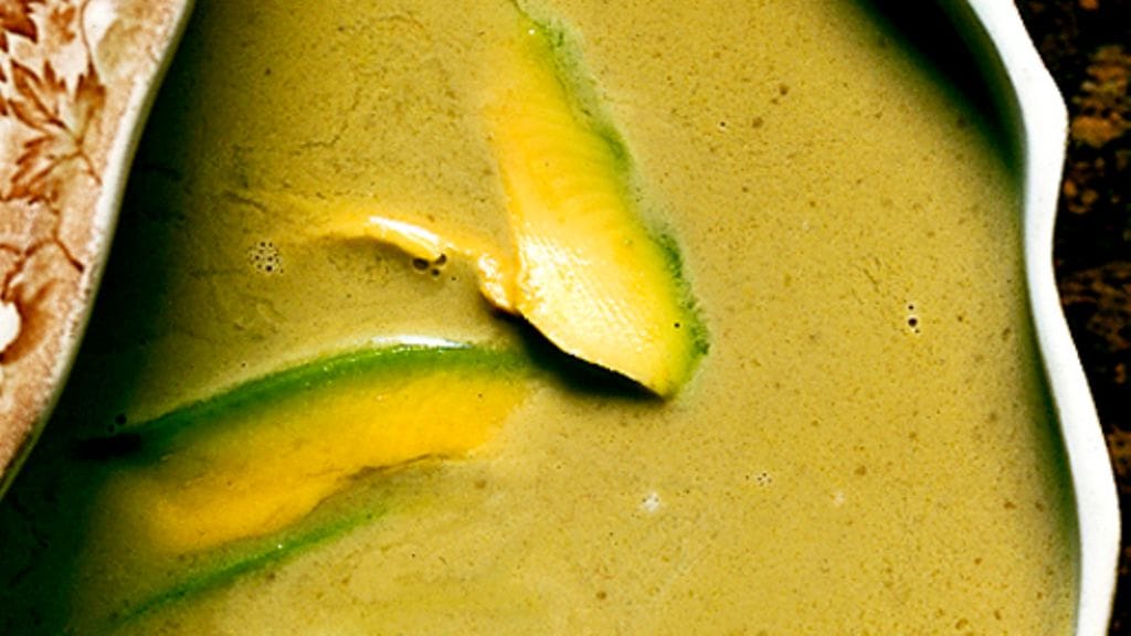 2. Kuumenna liemi kiehuvaksi, ota liedeltä. Vatkaa mukaan avokado, mausta suolalla, pippurilla ja sherryllä. Koristele halutessasi muutamalla avokadoviipaleella.