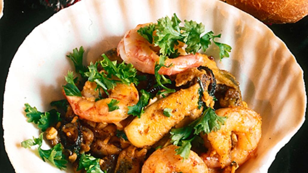 2. Kuori katkaravut ja sekoita ne valutettujen simpukoiden kera. Jaa annoskulhoihin.