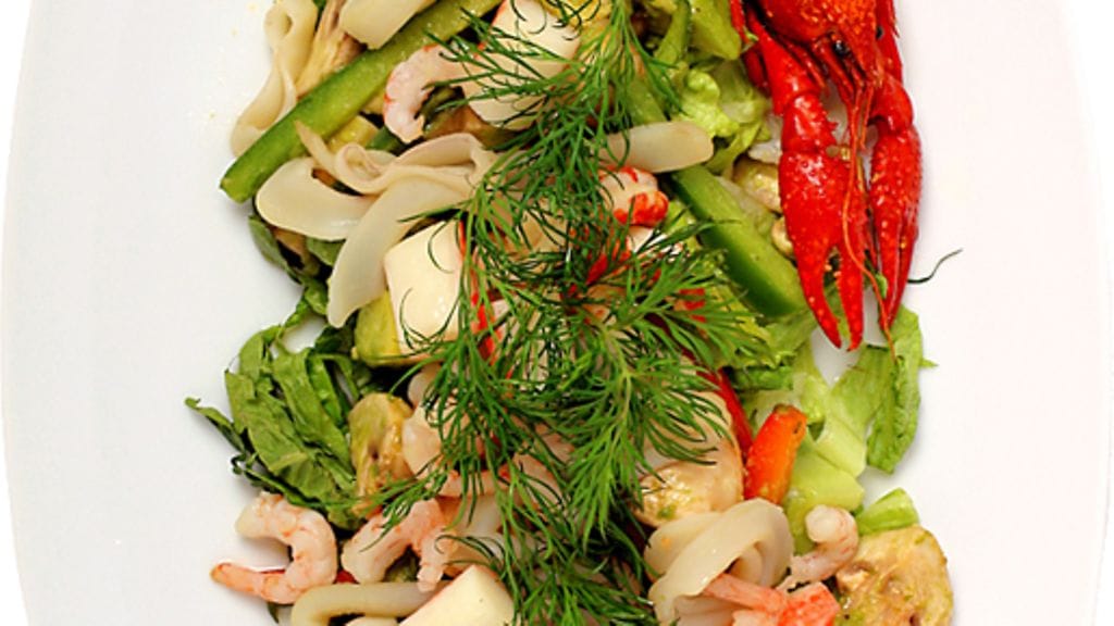 1. Sekoita marinadi valkoviinistä ja appelsiinimehusta. Purista joukkoon valkosipulinkynsi. Marinoi raputankoja, rapuja ja mustekalaa tunnin ajan. Sekoita sitruunaliemi sitruunamehusta ja öljystä. Mausta suolalla ja pippurilla. Leikkaa herkkusienet lohkoiksi. Pane ne sitruunaliemeen ja anna marinoitua tunnin ajan.