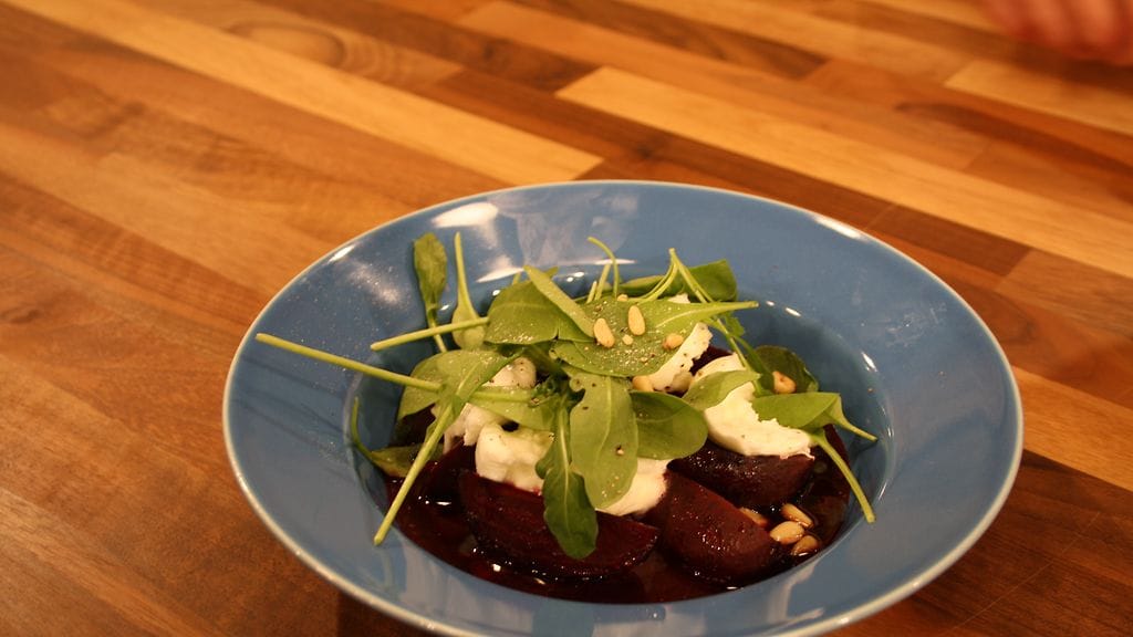 Poista vesi juustosta. Revi juustopallosta suikaleita punajuurien päälle. Halutessasi nostele päälle rucolaa antamaan ruokaisuutta. Mausta pinta vielä mustapippurilla ja tarkista suola. Herkuttele paahdetun maalaisleivän kanssa