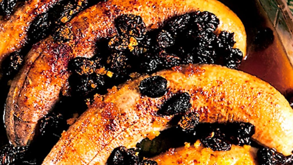 1. Kuumenna uuni 250 asteeseen. Halkaise banaanit pitkittäin ja aseta ne uunivuokaan.