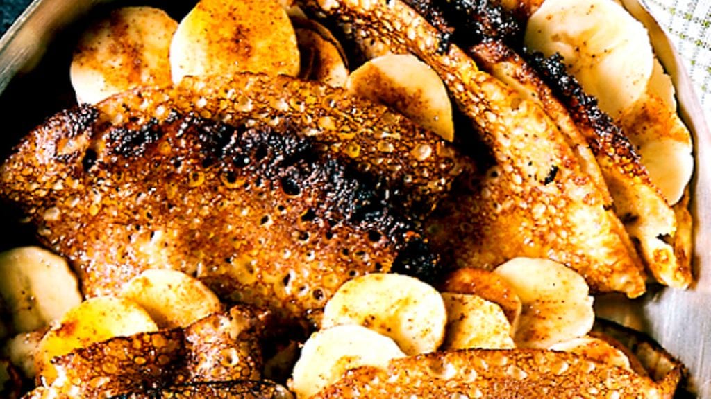 2. Kuumenna uuni 250 asteeseen, napsauta vain ylävastus päälle. Kääntele banaaniviipaleet kanelissa. Taittele letut neljään osaan ja täytä ”taskut” banaaneilla. Laita letut uunivuokaan.