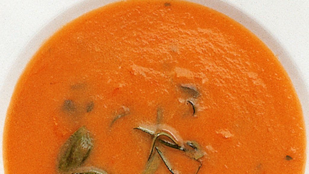 2. Kaada kuuma keitto lämmitetyille lautasille, sirottele pinnalle suikaloitu basilika ja tarjoile heti. Rapea leipä on tälle hyvä kaveri.