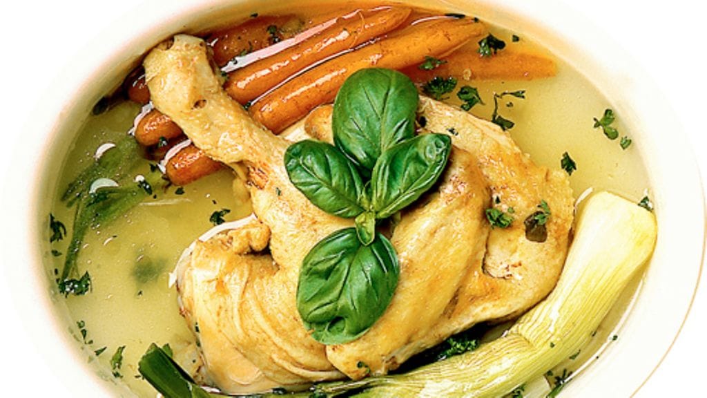 3. Nosta broilerin puolikkaat ja kasvikset kattilasta lämmitettyyn kulhoon tai syvälle tarjoiluvadille. Siivilöi joukkoon keitinliemi ja ripottele pinnalle hienonnettua persiljaa.