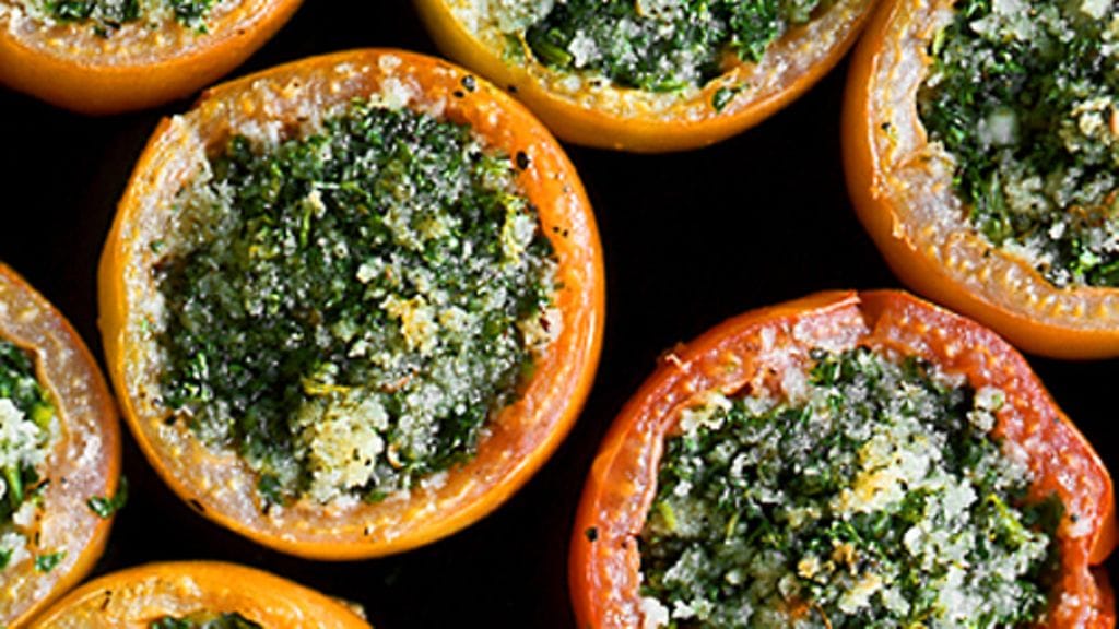 1. Kuumenna uuni 190 asteeseen. Halkaise tomaatit ja koverra sisus. Suolaa tomaatit sisältä ja valuta. Sekoita leivänmurut, persilja, basilika ja valkosipuli kulhossa. Suolaa ja pippuroi, lisää niin paljon öljyä että seoksesta tulee paksua tahnaa.