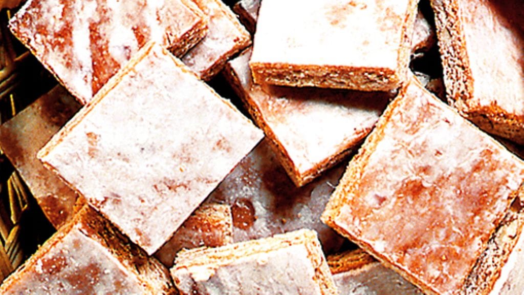 1. Kuumenna hunaja ja kidesokeri kiehuvaksi, lisää puolet jauhoista. Lisää manteli, hillottu appelsiininkuori, kaneli, muskotti ja neilikka ja sekoita. Lisää sitten loput jauhot, Kirschwasser, raastettu appelsiininkuori sekä sitruunamehu. Työstä taikinaksi ja laita kylmään lepäämään 15 minuutiksi.