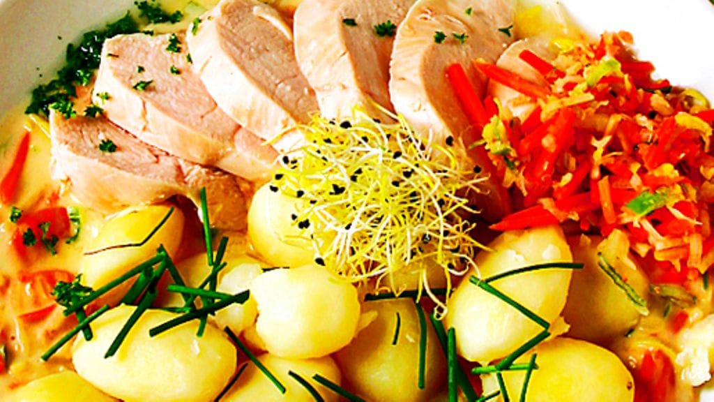 3. Puhdista ja hienonna koristeeksi tuleva purjo, hienonna ruohosipuli. Keitä perunat. Paloittele kananliha hienoiksi viipaleiksi. Asettele kanaviipaleet syville lautasille ja kaada keitto päälle. Tarjoile keitettyjen perunoiden kanssa, koristele ruohosipulilla ja purjolla.