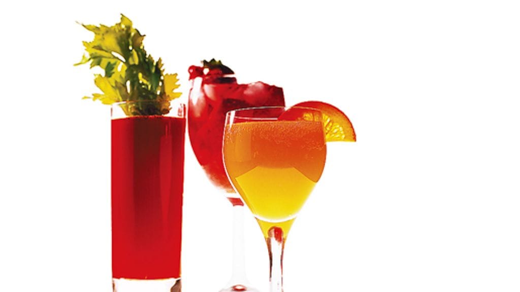 1. Bloody Mary: Sekoita vodka ja tomaattimehu suoraan lasiin. Mausta sellerisuolalla, vastajauhetulla mustapippurilla ja muutamalla tipalla worcestershirekastiketta ja/tai Tabascoa. Lisää runsaasti jäitä ja koristele drinkki sellerinvarrella.