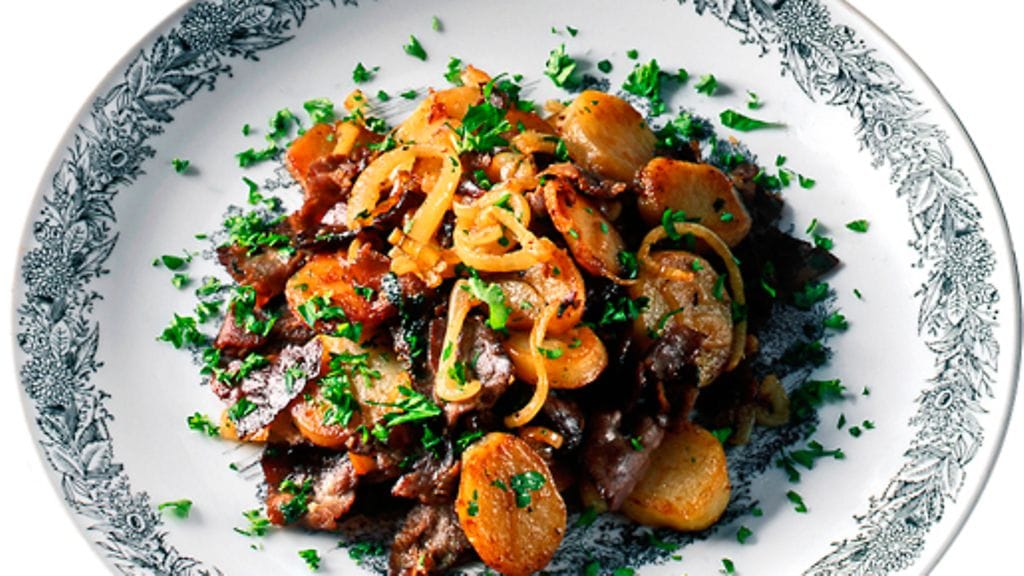 2. Ruskista liha nopeasti ja lisää sitten perunat ja sipulit. Purista joukkoon valkosipulinkynsi ja sekoita varovasti. Pirskauta päälle viinietikkaa, mausta suolalla ja pippurilla ja ripottele päälle persiljaa ennen tarjoilua.