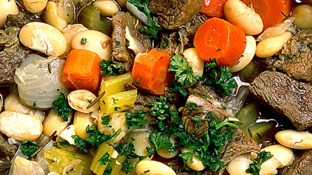 2. Silppua persiljanlehdet. Säästä varret - sido ne yhteen puuvillalangalla. Kuori ja leikkaa sipuli, porkkanat ja selleri isohkoiksi paloiksi. Kuori valkosipuli ja leikkaa liha noin 2½-senttisiksi kuutioiksi. Kuumenna öljy padassa. Pane liha pataan ja pyörittele öljyssä. Liha ei saa ruskistua, sen pinnan tulee vain kevyesti harmaantua.