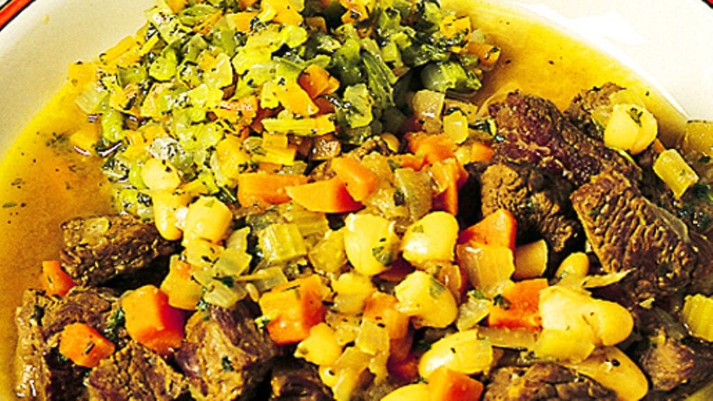 1. Laita pavut likoamaan yön yli. Hienonna persilja. Kuori ja hienonna sipuli, porkkanat ja selleri karkeasti. Kuori valkosipulinkynnet. Ruskista liha öljyssä ja laita pataan. Kaada päälle viini ja anna porista kunnes neste on lähes haihtunut.
