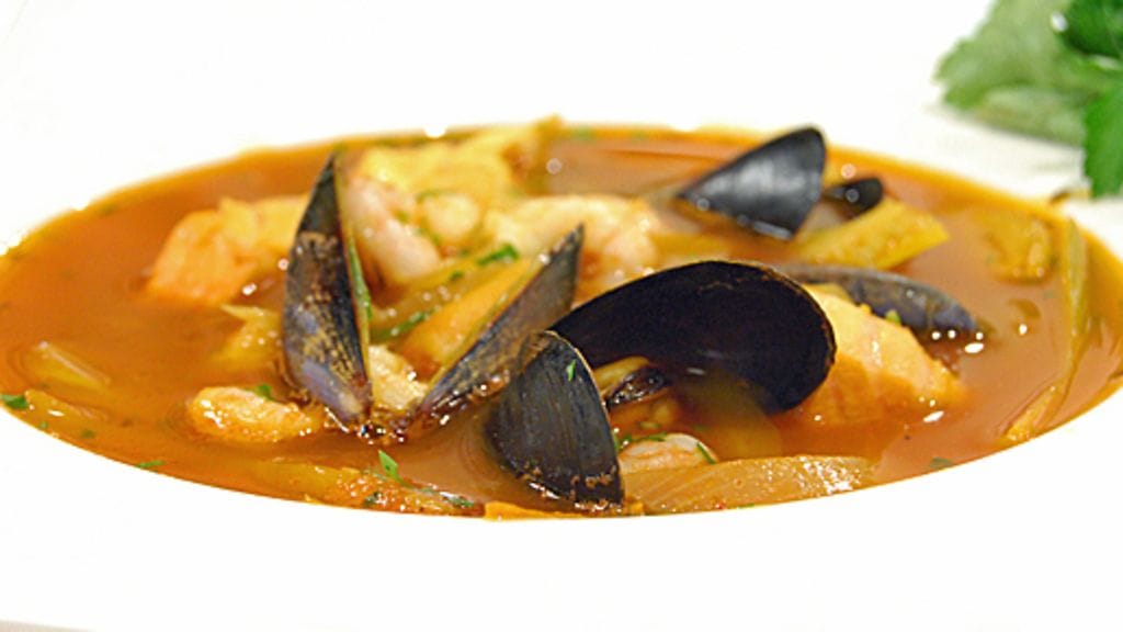 Lopuksi lisää kalat sekä äyriäiset kattilaan ja keitä muutaman minuutin ajan. Koristele keitto tuoreilla yrteillä.